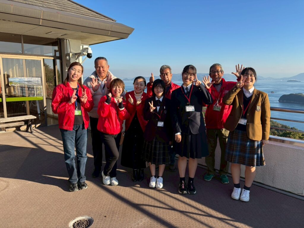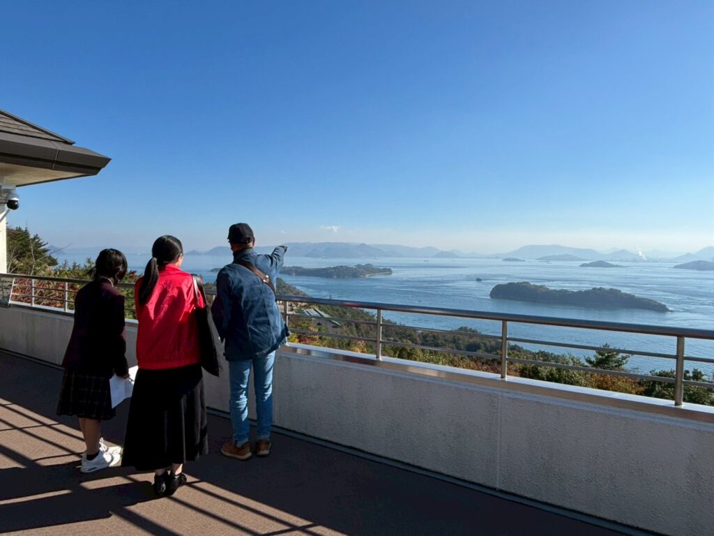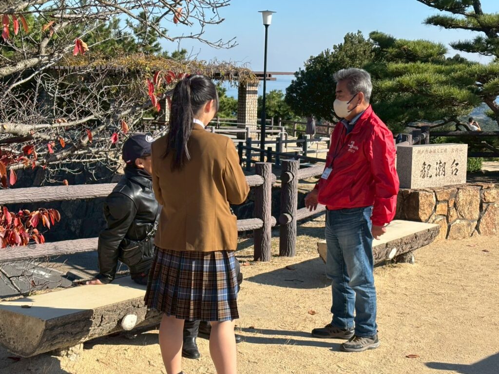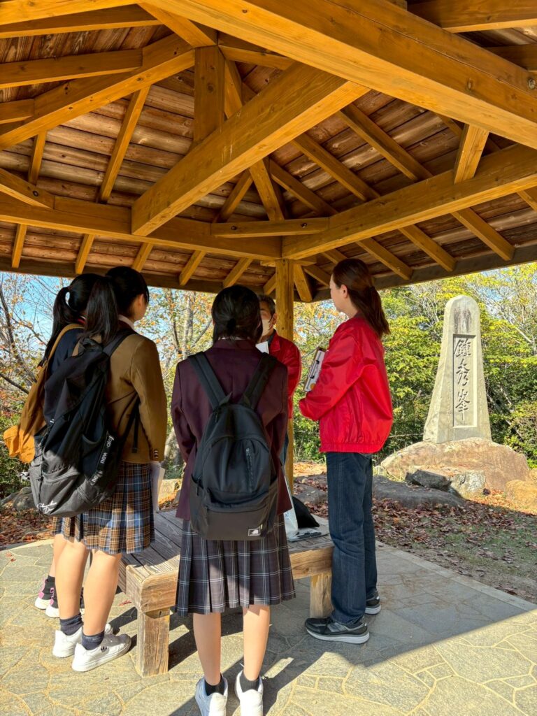 その後、ガイド協会メンバーの説明を聞きながら、実際に鷲羽山を歩きました。ビジターセンターのテラスからの眺望はまるで絵画のようで、地元に住む私たちでさえ感嘆の声をあげるほどでした。また紅葉も見頃を迎えており、センターから頂上、東屋までの散策を清々しい気分で楽しむことができました。生徒の皆さんには、道中で新しい情報や知識をたくさん学んでいただくこともできました。