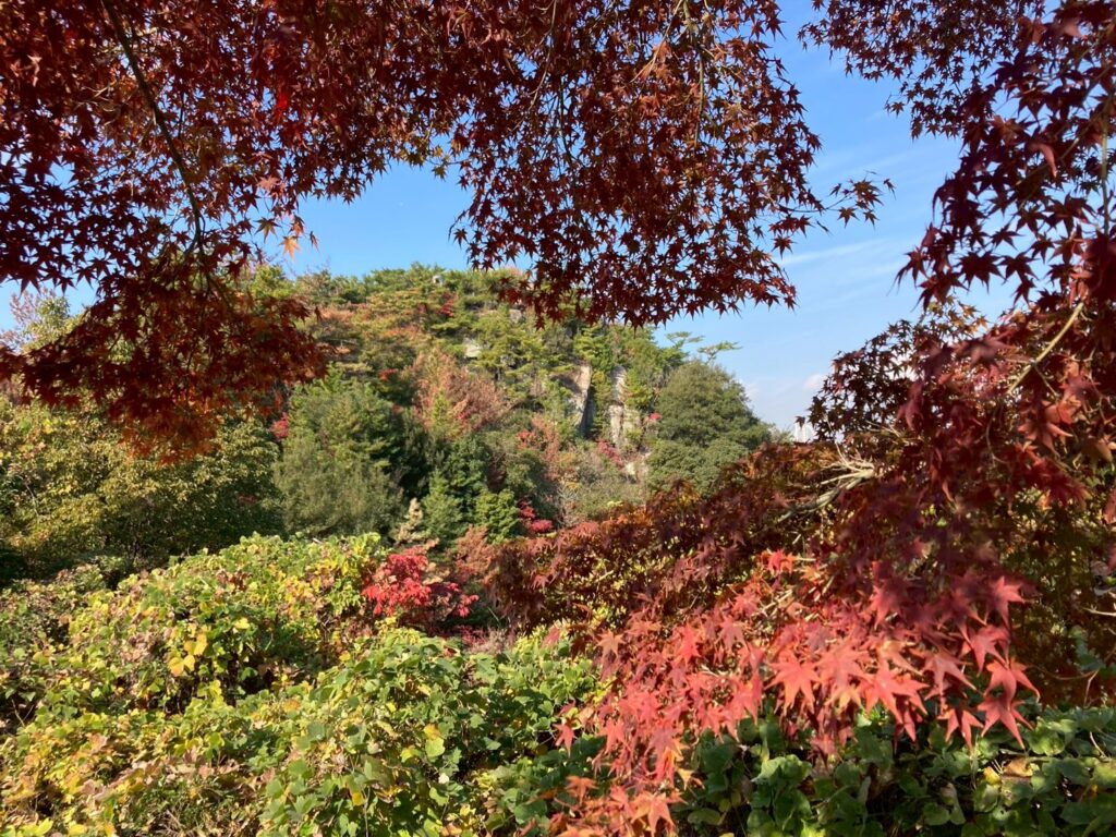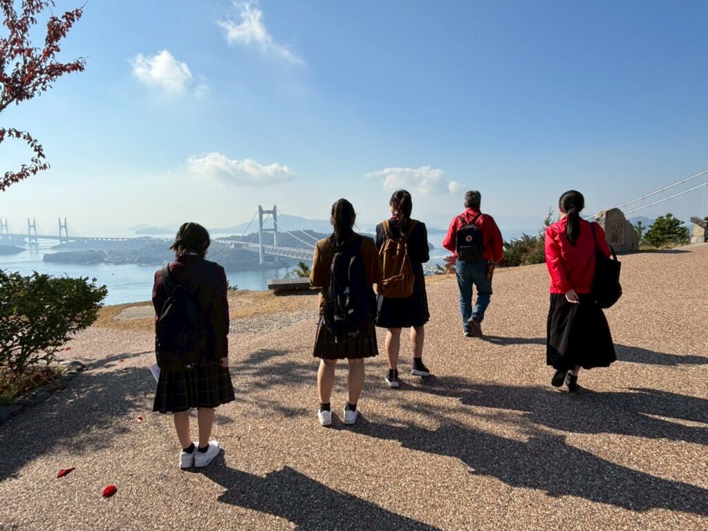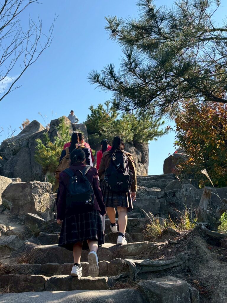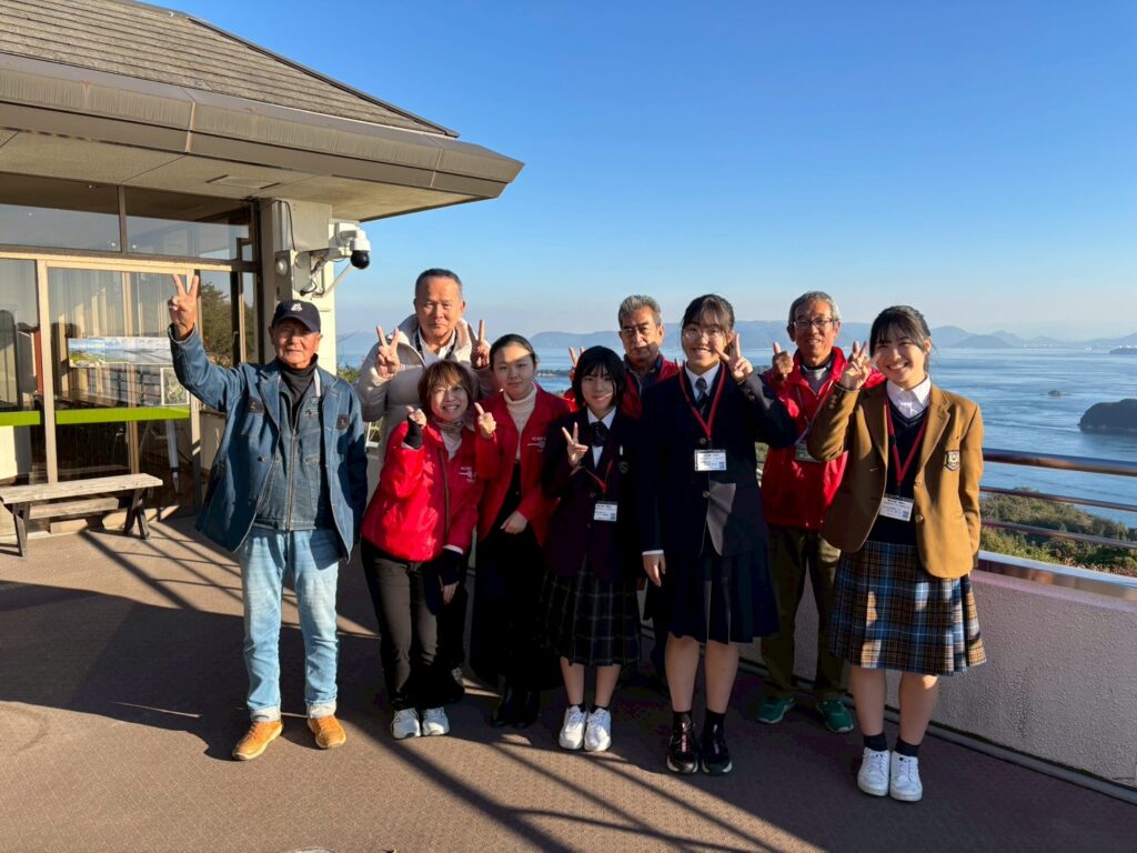 その後、ガイド協会メンバーの説明を聞きながら、実際に鷲羽山を歩きました。ビジターセンターのテラスからの眺望はまるで絵画のようで、地元に住む私たちでさえ感嘆の声をあげるほどでした。また紅葉も見頃を迎えており、センターから頂上、東屋までの散策を清々しい気分で楽しむことができました。生徒の皆さんには、道中で新しい情報や知識をたくさん学んでいただくこともできました。